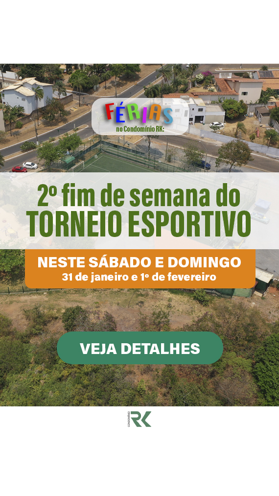 Venha para o segundo fim de semana do nosso 1º Torneio Esportivo - Férias RK! Clique e veja detalhes dos esportes e horários.
